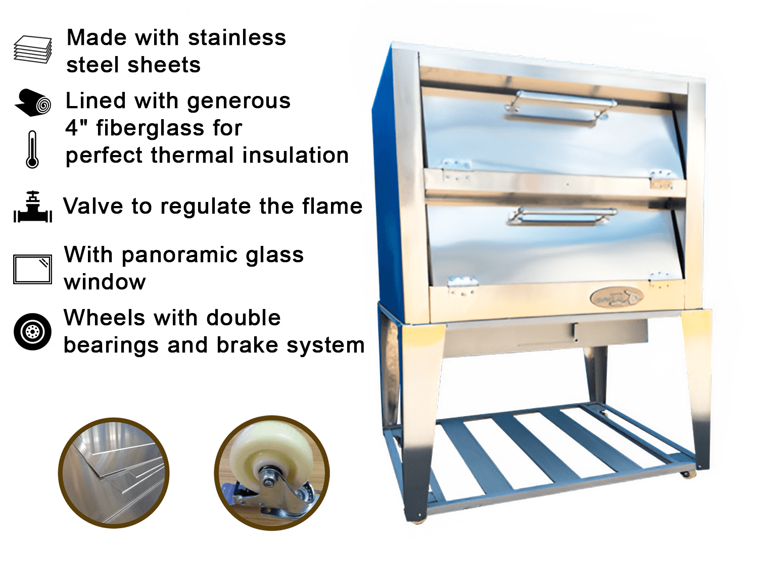 La ventana panorámica de vidrio templado ofrece una visión clara del proceso de horneado, permitiendo una fácil supervisión sin comprometer la retención del calor. Una válvula de control de llama garantiza una combustión eficiente, mientras que sus ruedas de doble rodamiento con sistema de frenado añaden movilidad y seguridad.