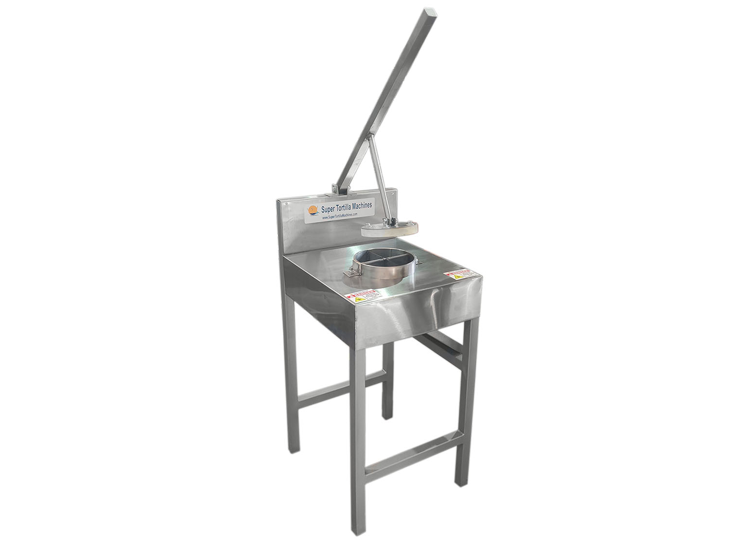 This manual tortilla cutting machine is designed with an upper lever system that allows the operator to push whole tortillas toward a cutting blade located underneath.